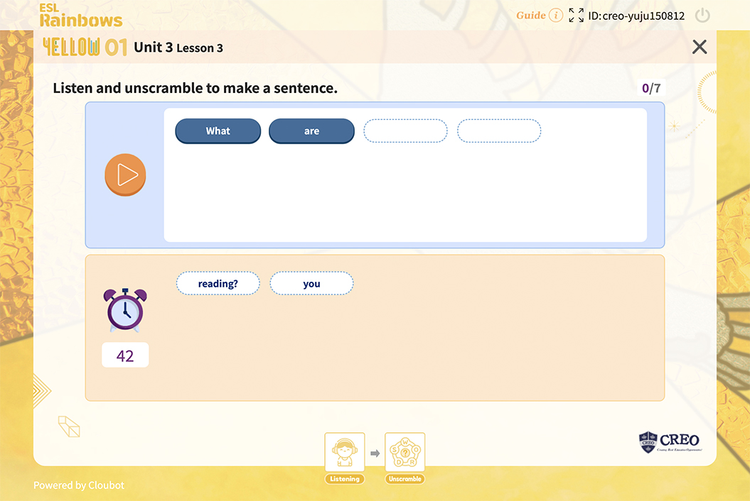 문장 학습 단계로 Listen & Repeat, Unscramble, Dictation 등 다양한 학습 툴에서 문장 학습을 듣고, 말하고 녹음 할 수 있습니다.