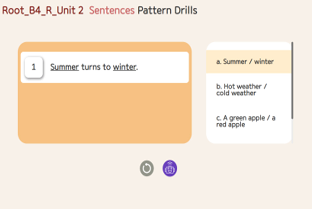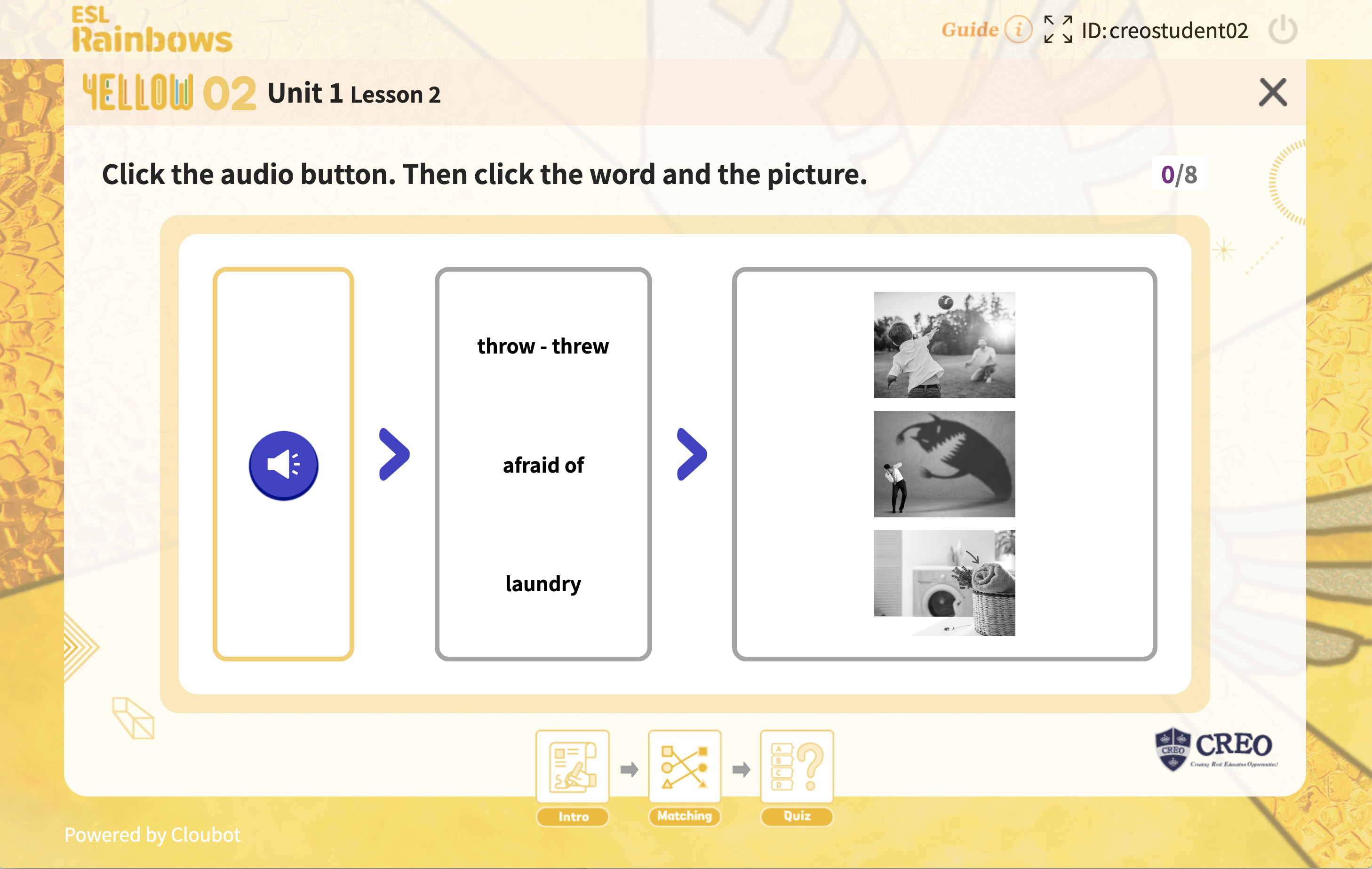 어휘에 대한 온라인 학습 단계이며 이미지와 단어를 매칭 하며 학습 한 후 Word Practice 와 Typing 훈련을 통해 어휘를 익힐 수 있습니다. 레벨에 따라 Word Game과 Quiz 등을 추가 할 수 있습니다.